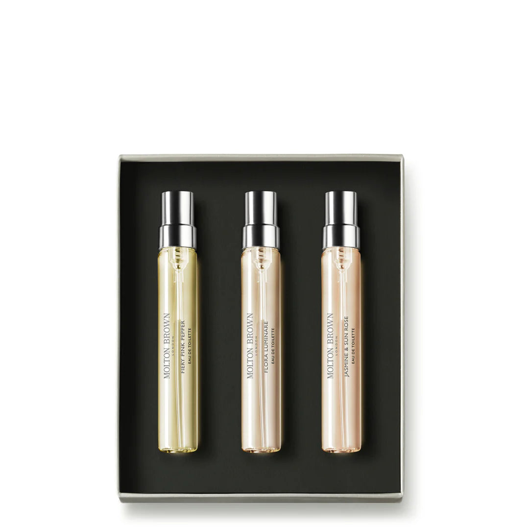 Explore a trio of Molton Brown's cherished Eaux de Parfum with the Floral & Spicy Discovery Set, featuring Fiery Pink Pepper, Delicious Rhubarb & Rose, and Rose Dunes. Each 7.5ml fragrance offers a unique scent journey, perfect for gifting or personal indulgence.